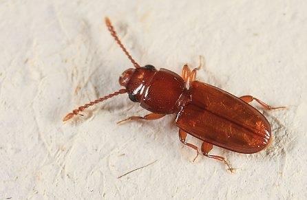米扁虫颜色为红棕色。成虫长2至3mm。从上方观察时,米扁虫头部后面的外壳在前角上有圆形突起。使用放大镜可以更容易地看到这些特征。